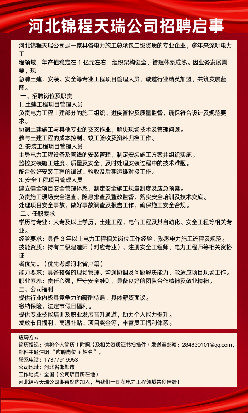 河北锦程天瑞公司招聘启事 河北锦程天瑞公司是一家具备电力施工总承包二级资质的专业企业,多年来深耕电力工 程领域,年产值稳定在 1 亿元左右,组织架构健全,管理体系成熟。因业务发展需要,现 急聘土建、安装、安全等专业工程项目管理人员,诚邀行业精英加盟,共筑发展蓝图。 一、招聘岗位及职责 1. 土建工程项目管理人员 负责电力工程土建部分的施工组织、进度管控及质量监督,确保符合设计及规范要求。 协调土建施工与其他专业的交叉作业,解决现场技术及管理问题。 参与土建工程的成本控制、竣工验收及资料归档工作。 2. 安装工程项目管理人员 主导电力工程设备及管线的安装管理,制定安装施工方案并组织实施。 监控安装施工进度、质量及安全,及时处理安装过程中的技术难题。 配合做好安装工程的调试、验收及后期运维对接工作。 3. 安全工程项目管理人员 建立健全项目安全管理体系,制定安全施工规章制度及应急预案。 负责施工现场安全巡查、隐患排查及整改监督,落实安全培训及技术交底。 处理项目安全事故,做好事故调查及报告工作,确保施工安全合规。 二、任职要求 学历与专业:大专及以上学历,土建工程、电气工程及其自动化、安全工程等相关专业。 经验要求:具备 3 年以上电力工程相关岗位工作经验,熟悉电力施工流程及规范。 技能资质:持有二级建造师(对应专业)、注册安全工程师、电力工程师等相关资格证 者优先。(优先考虑河北省户籍) 能力要求:具备较强的现场管理、沟通协调及问题解决能力,能适应项目现场工作。 职业素养:责任心强,严守安全准则,具备良好的团队合作精神及敬业精神。 三、公司福利 提供行业内极具竞争力的薪酬待遇,具体薪资面议。 缴纳保险,法定节假日福利。 提供专业技能培训及职业发展晋升通道,助力个人能力提升。 发放节日福利、高温补贴、项目奖金等,丰富员工福利体系。 四、应聘方式 简历投递:请将个人简历(附照片及相关资质证书扫描件)发送至邮箱:284830101@qq.com, 邮件主题注明 “应聘岗位 + 姓名”。 公司地址:河北省邯郸市 工作地点:全国(公司项目所在地) 河北锦程天瑞公司期待您的加入,与我们一同在电力工程领域共创佳绩!