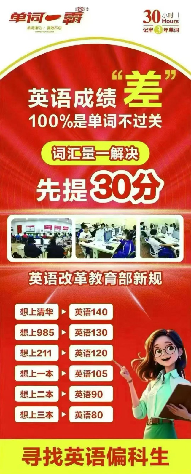 6小时记住一学期单词 30小时记住三年单词 为什么7年级英语下滑? 因为单词“家底”掏空了 “小学满分,初一勉强够用 初二瞬间滑坡”的现象屡见不鲜 究其根源,关键差距就在于: 单词储备不足❗