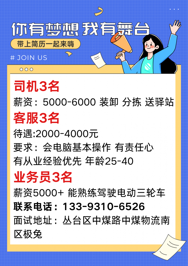 招聘 业务员3名 薪资5000+ 能熟练驾驶电动三轮车 面试地址:丛台区中煤路中煤物流南区极兔