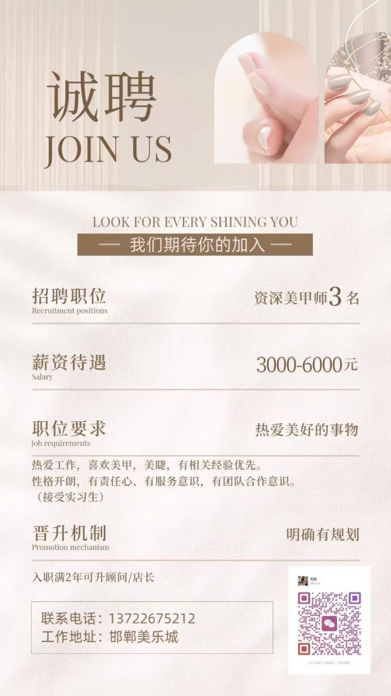 招聘职位:临时工 美甲师