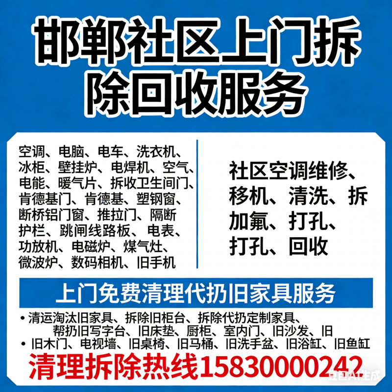 邯郸社区上门拆除回收,空调电脑,电车洗衣机,冰柜壁挂炉,电焊机空气能,暖气片,拆收卫生间门,肯德基门,塑钢窗,断桥铝门窗,推拉门隔断护栏,,跳闸线路板电表,功放机电磁炉,油烟机煤气灶,微波炉,数码相机,旧手机 社区空调维修移机清洗拆卸加氟打孔回收。 (上门免费清理代扔旧家具服务)!清运淘汰旧家具拆除旧柜台,拆除代扔定制家具,帮扔旧写字台,帮扔旧床垫,拆除代扔厨柜,拆除清理室内门,帮扔旧沙发,拆扔旧木门电视墙,帮扔清运旧桌椅,帮扔旧马桶旧洗手盆,旧浴缸旧鱼缸……清理拆除