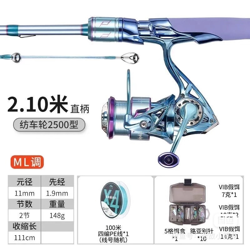 皓顿海豚路亚马口竿套装,2.1米ML调直柄,碳素杆,重量148g,收缩长111cm。配纺车轮2500型,线轮顺滑好用,适合钓鲈鱼、翘嘴、马