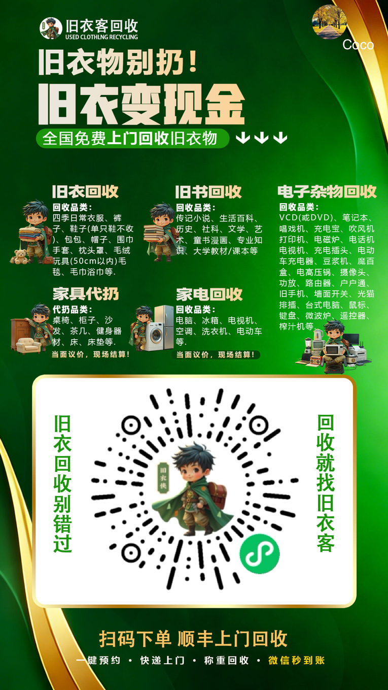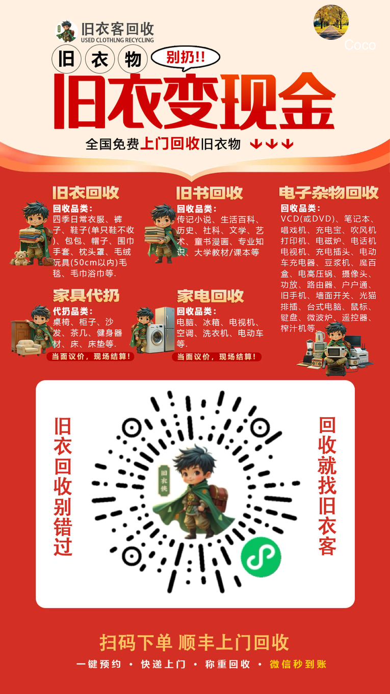 全国旧衣物回收,冰箱彩电大沙发,上门免费取件,旧衣旧物品绿色回收!!?