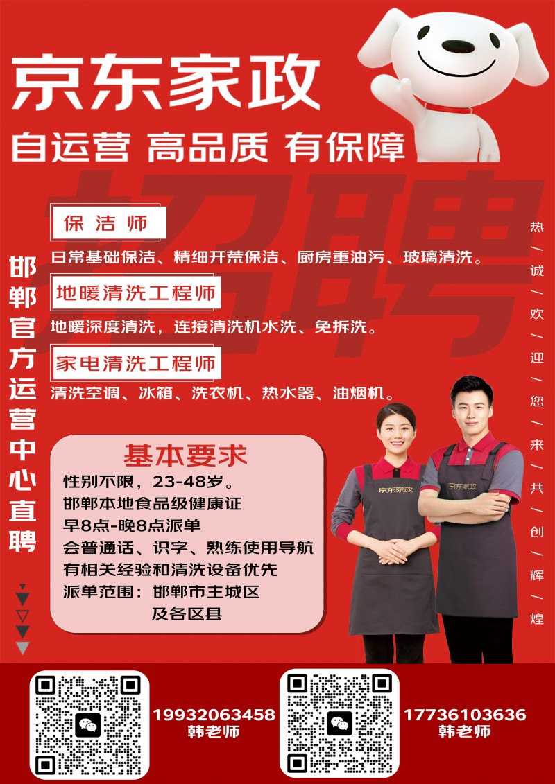 【京东家政在招岗位】 日常保洁师(女士,接单中) 地暖清洗工程师(男士,本月上线) 家电清洗工程师(男士,本月上线) 厨房重油污保洁师(男女均可) 开荒保洁师(男士优先,储备) 擦玻璃师傅(储备) [太阳]【入职要求】 年龄:23-48岁 学历:初中及以上学历,熟练操作导航 健康:邯郸本地食品级健康证 技能:经验不限,会骑电动车 无犯罪记录(系统每月背调) [太阳]【岗位信息】 招聘范围:邯郸市主城区(武安、永年、峰峰、成安、大名等县城及周边) 派单范围:居住地方圆5公里,系统自动派单 工作时间:早8:00-晚8:00之间,每周休1天 薪资结构:时薪制/订单一口价,每月15日提现到银行卡 敬待您来京东家政邯郸运营中心参观咨询,地址:邯郸市复兴区建设大街南头,聚钢大厦(华康医院)6楼京东家政 培训来邯郸运营中心培训,工作地址就是以家为中心5公里内系统派单。